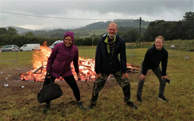 Een paar dagen later zien we diezelfde vrienden op een dorpsfeest in de buurt. Het is Sint Jansdag, en er worden gratis lange vingers met warme, échte chocolademelk uitgedeeld. Bij een lange tafel kun je boeketjes kopen voor boven je deur. Een vrouw legt geduldig uit wat elk individueel bloemetje betekent voor je gezondheid en geluk. Er is ook een groot vuur, dat de kou en stromende regen van die avond doet vergeten.